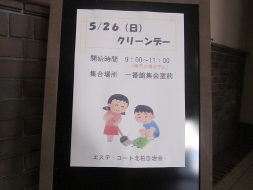 5月26日(日)9:00から、春季クリーンデーが実施されました。 当日は大人32人、子供5人の合計37人の方が参加されました。 天候にも恵まれ、マンション敷地内、公園等周辺エリアにおいて 参加者の皆様が互いに協力し合い、清掃作業を進めた結果、 定刻通り終了しました。参加者並びに環境委員の皆様お疲れ様でした。